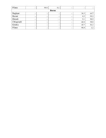 Pilana - 99.9 0.1 - - - Boron Baghpat - - - - 38.3 64.7 Baraut - - - - 0.5 99.5 Binauli - - - - 9.1 90.9 Chhaprauli - - - - 42.0 58.0 Khekra - - - - 45.7 54.3 Pilana - - - - 98.8 1.2