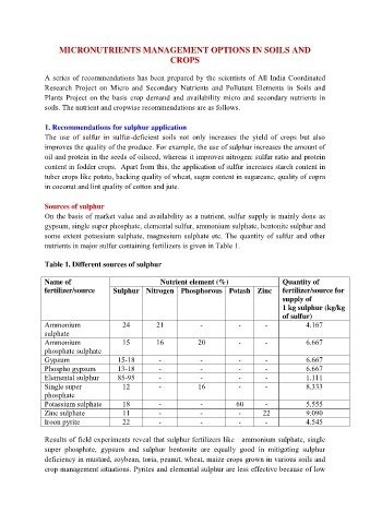 nutrients in major sulfur containing fertilizers is given in Table 1.