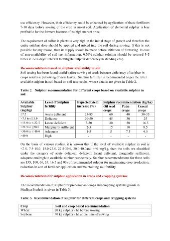 Table 2. Sulphur recommendation for different crops based on available sulphur in