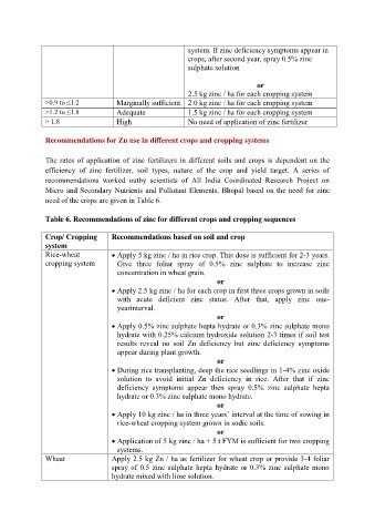 Table 6. Recommendations of zinc for different crops and cropping sequences