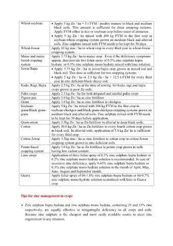 Soybean- Apply 5 kg Zn / ha mixed with 200 kg FYM to the first crop in