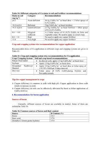 Table 14. Different categories of Cu status in soil and fertilizer recommendations